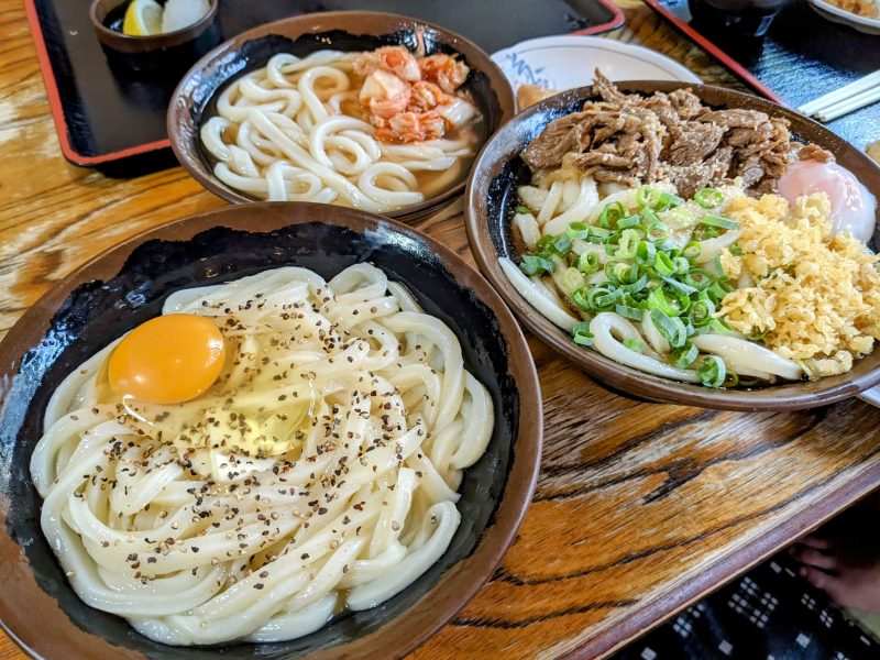 悩んだ末に釜バターうどんと温玉肉うどん、シンプルなキムチうどんを注文。