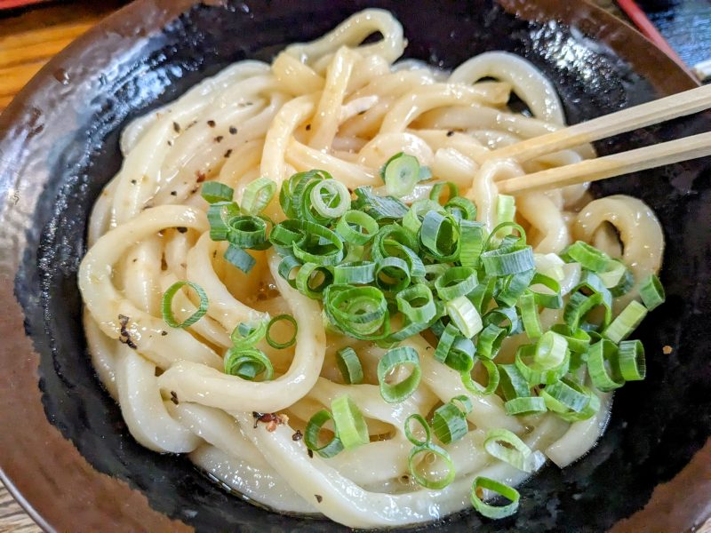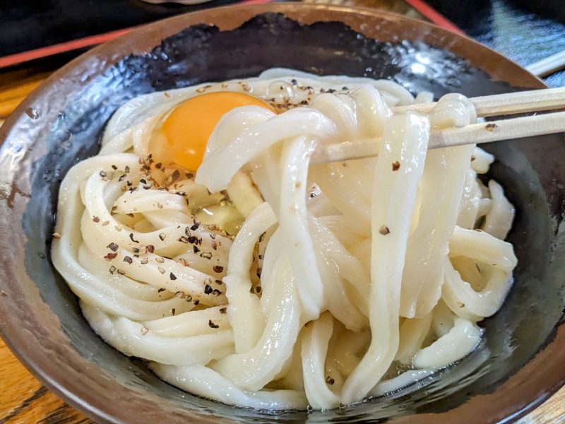 熱々の釜揚げうどんにバターと生卵を落とし、ブラックペッパー&だし醤油をかけられた「釜バターうどん」。うどん版カルボナーラって感じで、クセになる味わい!バターがうどんの熱でとろけて…これ、想像以上に美味しかったです。きっと朝からでもペロッと食べられちゃう魔性の一杯!