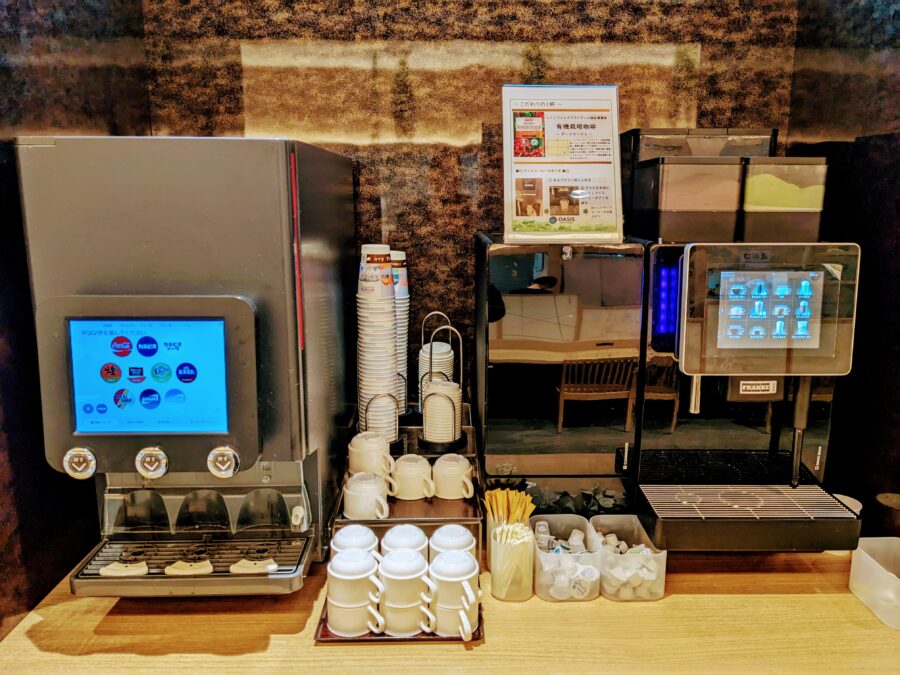 ドリンクバーは、ジュースや烏龍茶等を選べるアイス系のマシーンとコーヒーやココアなどを選べるホット系のマシーンの2台。アイスコーヒーなどを飲むときは、ホットコーヒーに氷を入れて作るタイプです。