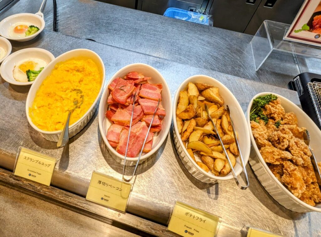 朝食定番メニューの玉子とベーコン。玉子は目玉焼きとスクランブルエッグに温泉卵の3種類。子供も大好きなポテトフライや唐揚げもあります。