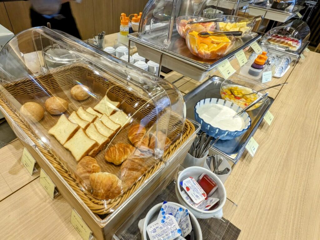 パンはミニフランスパン、デニッシュ食パン、クロワッサンの3種類。もちろん、トースターで焼いて食べることができます。