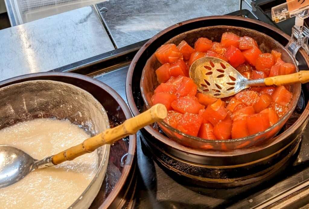 漬けまぐろの隣には、山芋があり、山かけ丼も作れます。