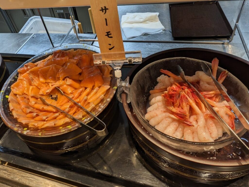 ドーミーイン福井で人気の海鮮コーナー。甘エビ、サーモン、 漬けまぐろが並び、丼にご飯と海鮮を乗せればオリジナルの海鮮丼が完成です!