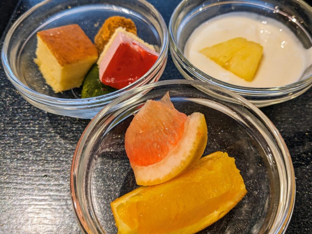 食事の後に食べる口直しのデザート。一口サイズのケーキとわらび餅に、フルーツはグレープフルーツやオレンジ、パインなどがあります。プレーンヨーグルトにパインを入れて食べてしました。