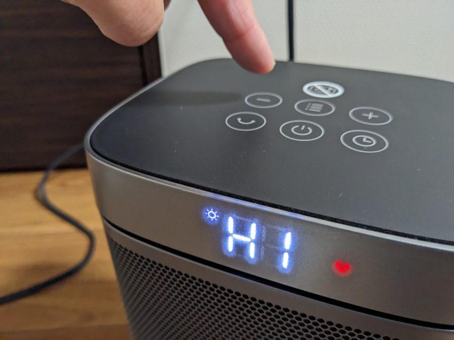 真ん中上の3本線を押して3つのモードに切り替えます。風量は3段階から選べ、ドライヤーのように稼働してすぐに暖かい風が出てきます。
