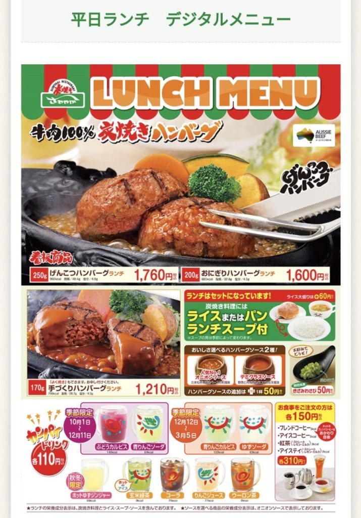 また、どちらのハンバーグもげんこつハンバーグと同じ中はレアで、さわやかならではの牛肉100%のハンバーグを楽しめます。