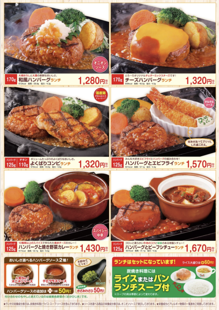 和風やチーズのハンバーグ、ハンバーグと焼き野菜カレーやエビフライなどがセットになったランチなど。