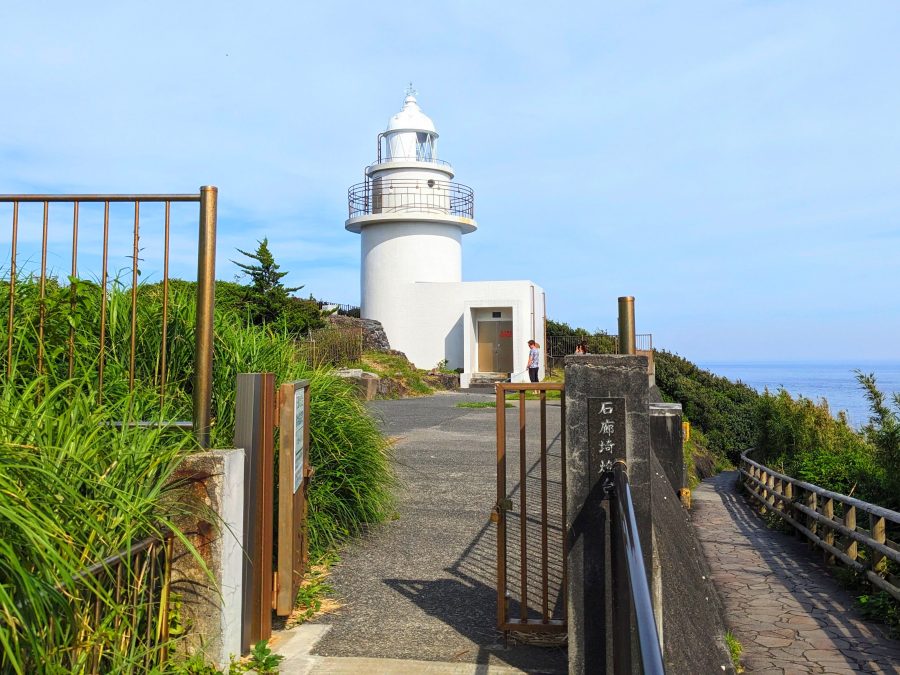 入口から徒歩5分ほどで「石廊埼灯台」に到着。明治4年にイギリス人技師プラントンの設計により建てられた、美しい白亜の灯台で、石廊埼のシンボル的存在として愛されています。