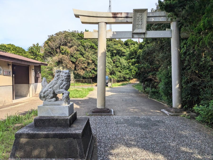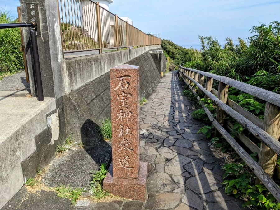 駐車場から歩いてすぐに石室神社の鳥居が現れます。社殿自体は最南端のすぐ近くなので、灯台よりも先にあります。鳥居の隣に建つのは、綺麗に整備されたトイレです。