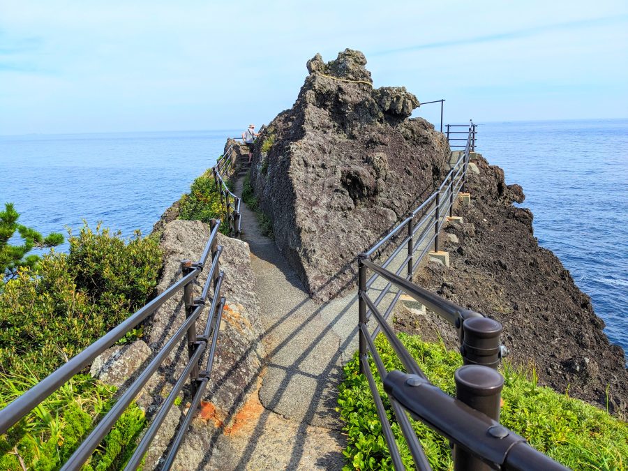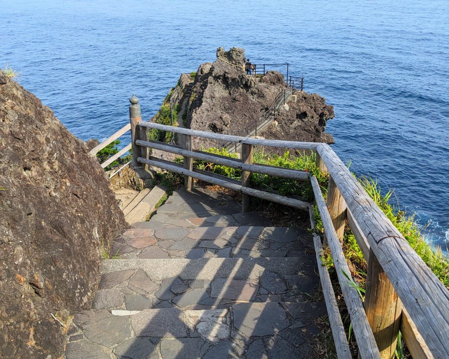 階段の先に見えるのが、最終目的となる最南端の崖です。ここから見下ろす景色が、よく写真で紹介されている絶景の構図になります。