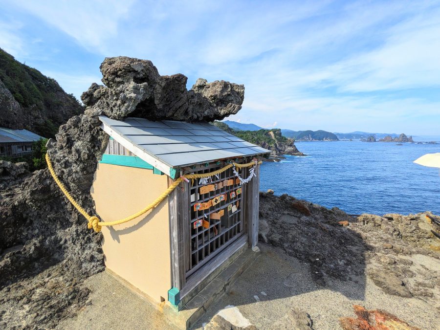 先端の崖に埋め込まれた祠は、縁結びのご利益があるとされる熊野神社です。恋愛成就を祈願した絵馬がたくさん掛けられています。