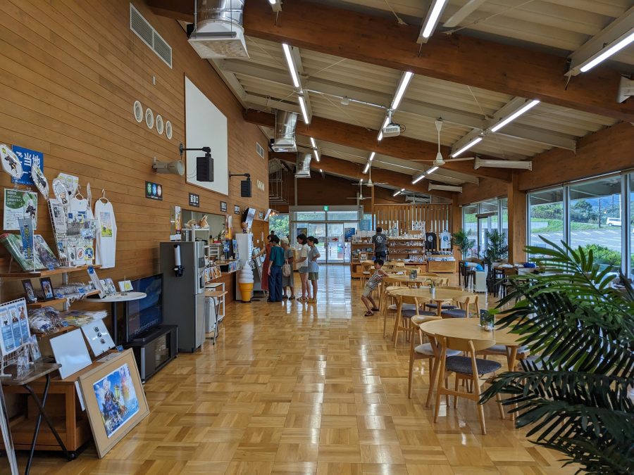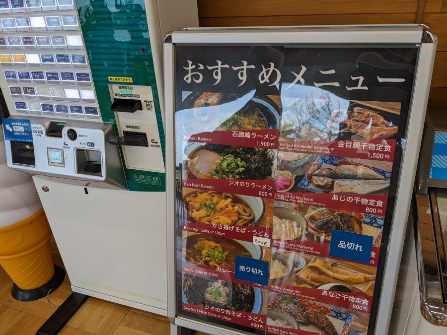 休憩棟では食事やカフェなども楽しめます。磯の香りたっぷりの海苔がどっさり乗ったジオのりラーメンや、下賀茂温泉塩を振りかけるソフトクリームが人気です。