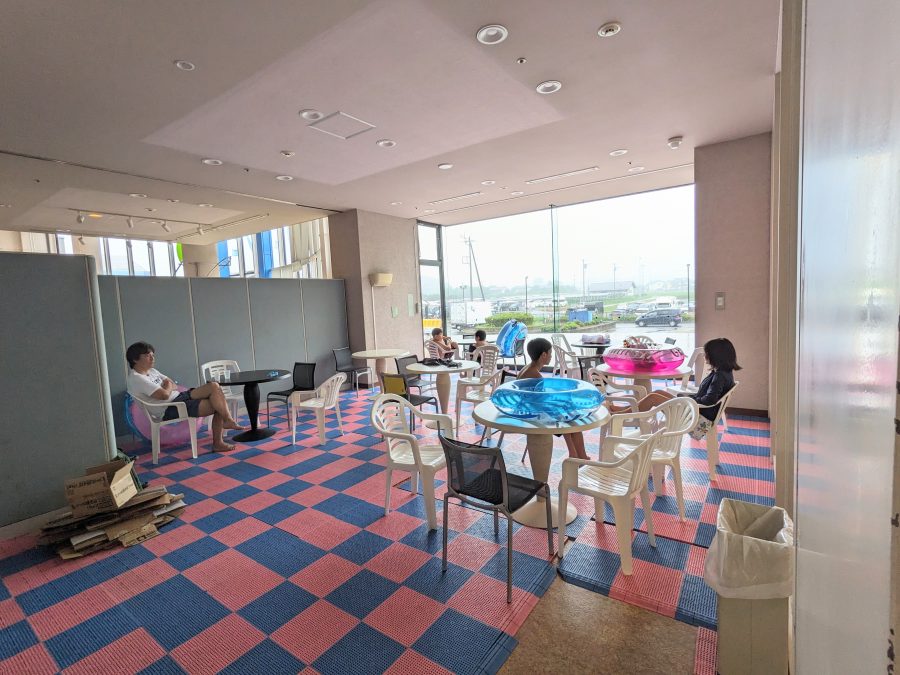 レジャーシートは持ち込み禁止です。その代わり、施設内に無料で座れる椅子が設置されています。プール内に入ったらまずは場所取りをしましょう。一階の流れるプールの周りにも椅子があり、そちらも利用可能です。