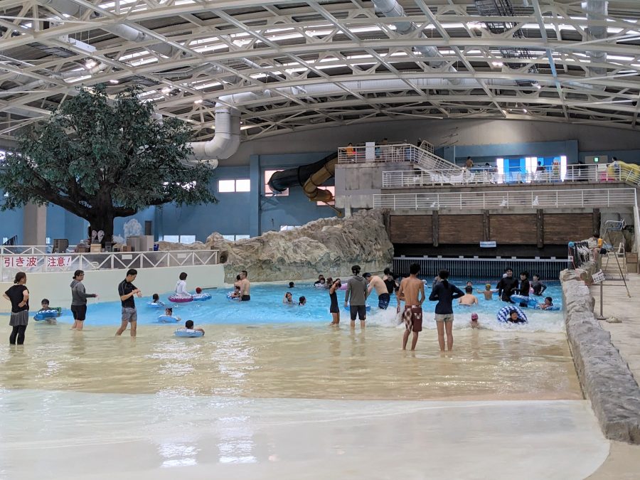 高い波も出せる装置ですが、混雑する時期は安全のため低い波のみです。それでも、小さい子供は十分満足できるはずです。浮き輪もOKです。