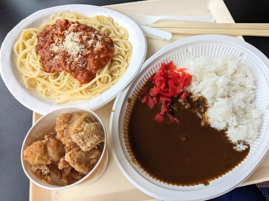 唐揚げにミートパスタ、カレーを食べました。見た目も味も完全にレトルトで、まさに昭和の海の家を彷彿させます。