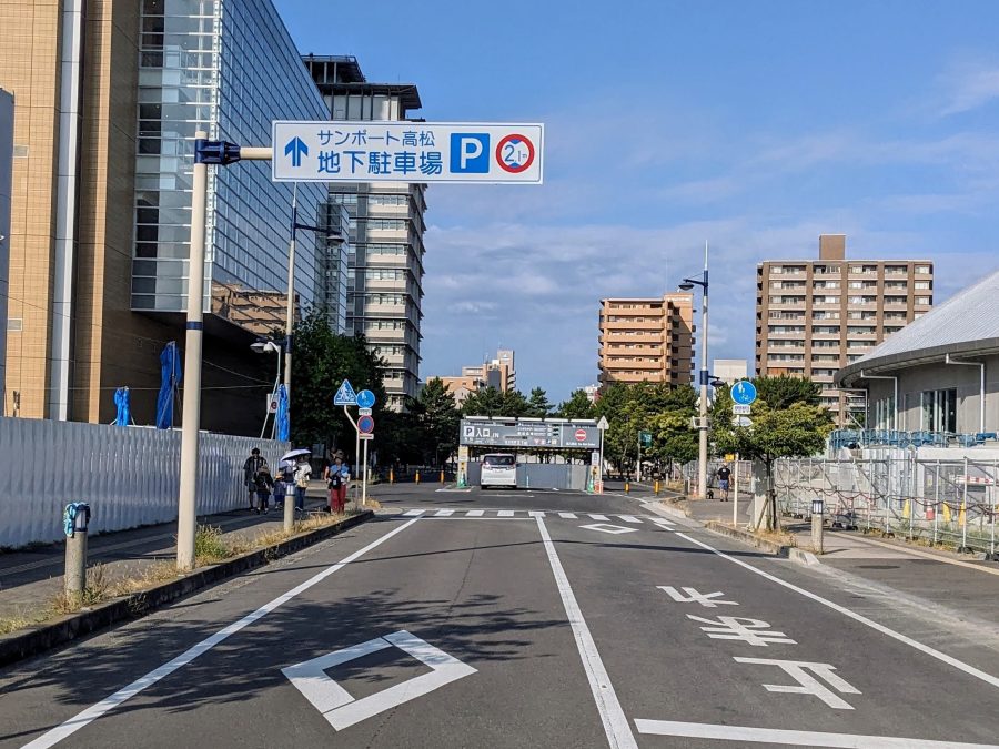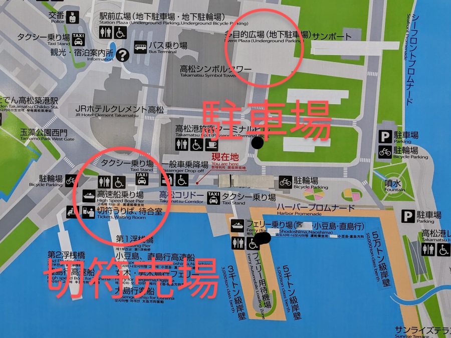 地下駐車場のサンポート高松が最寄りでオススメです。900台以上停められる駐車場のため、初めて来ると迷路みたいで何処に停めたらいいか分かりづらいです。何処に停めても問題ないですが、フェリー乗り場まで少し歩くため、出発時刻の30分以上前には来ることをオススメします。
