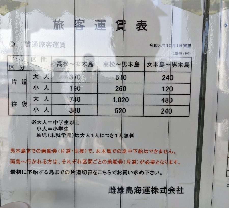 高松から女木島、男木島と周る一枚で買えるような周遊チケットはありません。高松から男木島、男木島から女木島、女木島から男木島と片道のチケットを現地の売場でそれぞれ購入します。