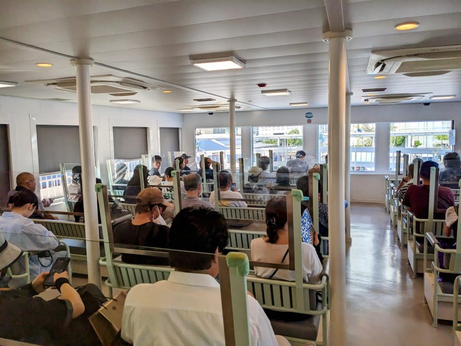 夏休みなどの繁忙期は、早めに行かないと座ることはできません。この日も船内客室は満席でした。その場合は、外の席に座るか海を見ながら立つしかありません。夏は日差しが強いため、なるべく日陰の場所を確保しましょう。