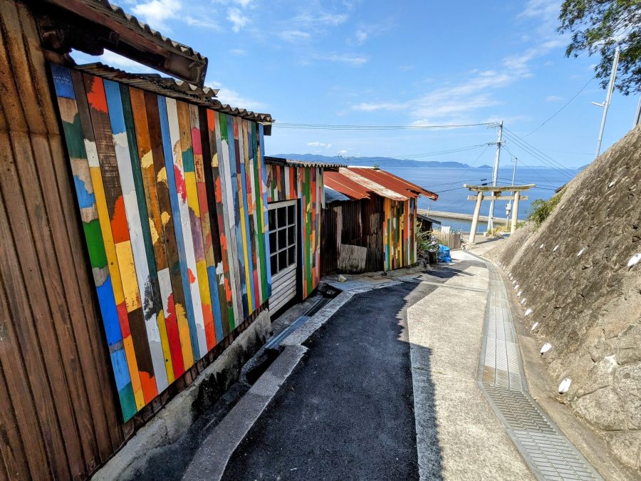 鳥居のすぐ脇にあるカラフルな壁画アート。ここも男木島の紹介で必ず紹介される撮影スポットです。