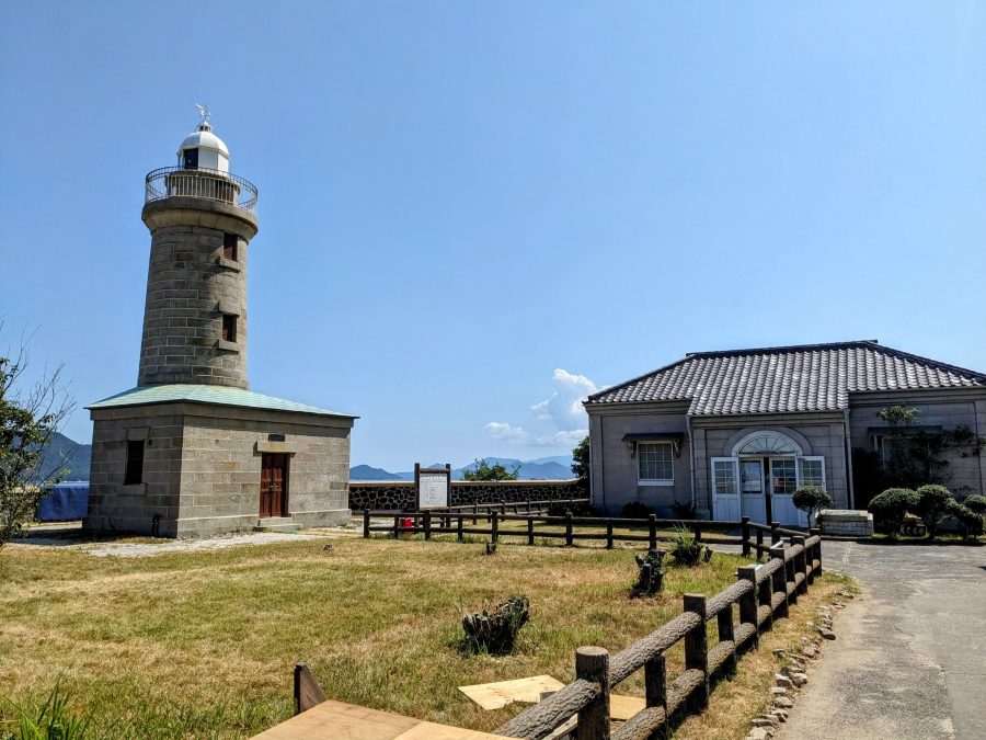 壁画アートから男木島灯台のある最北端まで約1.7キロ。徒歩25分程度です。海沿いを歩けば迷わず到着します。男木灯台は100年以上の歴史を誇り、さらによく見かける白い灯台ではなく、日本に2基しかない無塗装の石造りです。残念ながら、中には入れません。