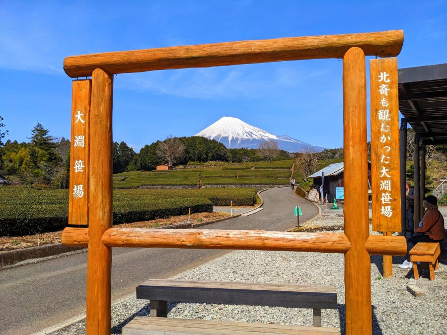 売店の目の前にある記念撮影スポット。実際は、枠を使わずにこの先の茶畑から写真を撮ると、よく大渕笹場の紹介で使われる富士山と茶畑の構図になります。