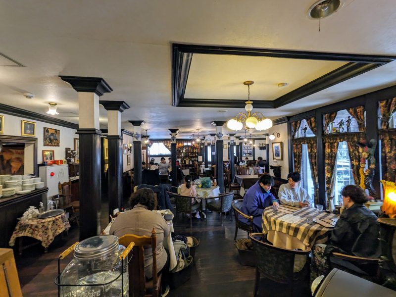 クラシカルな落ち着いた雰囲気のレストラン。アンティーク調のテーブルや椅子が並びます。冬はこちらで温まりながらゆっくりと食事を楽しむのがオススメ。
