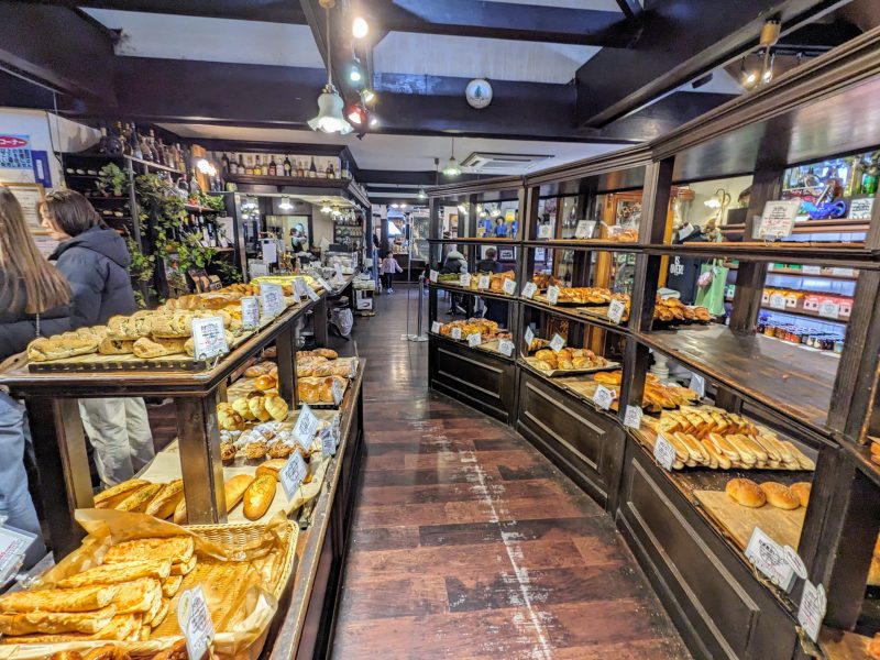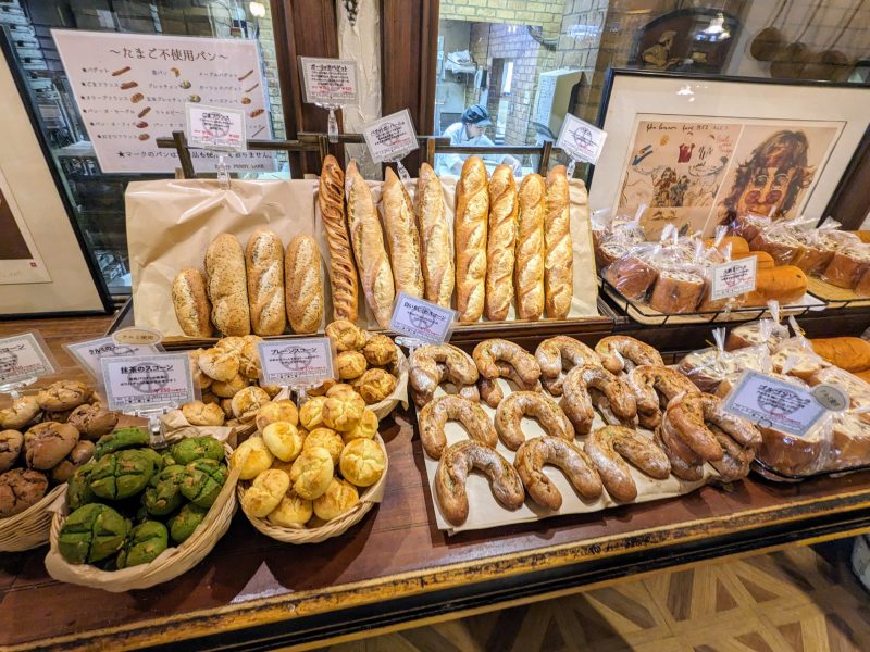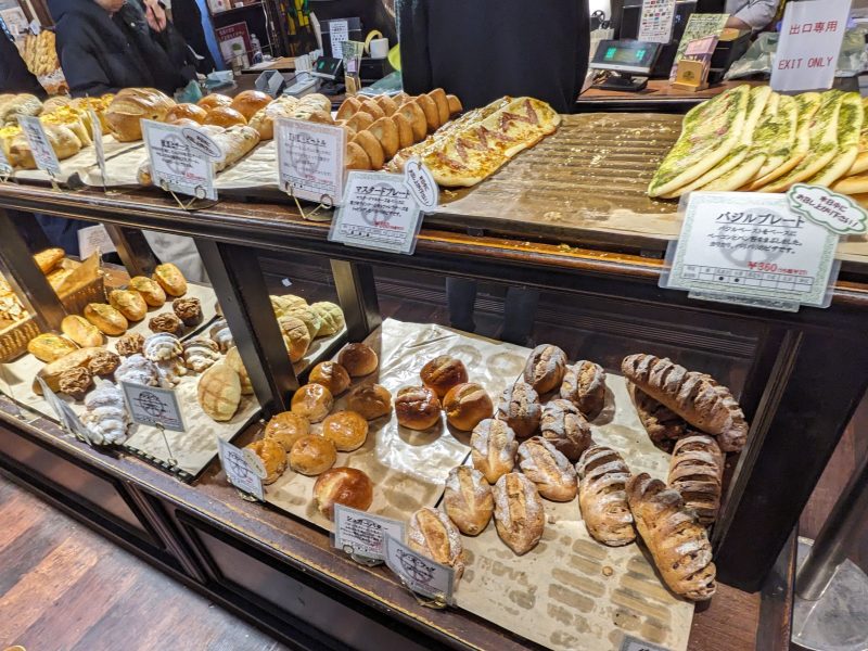 店内入って手前側がパンの販売スペースで、奥が食事のできるレストランです。棚の上には職人さんが丁寧に作り上げた種類豊富な焼きたてパンが並んでいます。