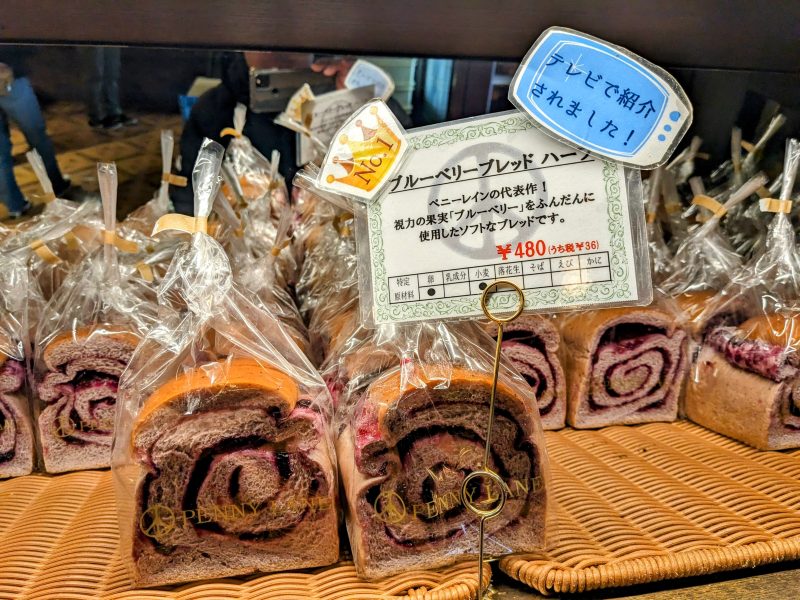 ペニーレインを訪れたら絶対に外せない一品が「ブルーベリーブレッド」。たっぷりのブルーベリーが練り込まれたしっとりとした生地は、甘さと酸味のバランスが絶妙で、一度食べると忘れられない味わいです。