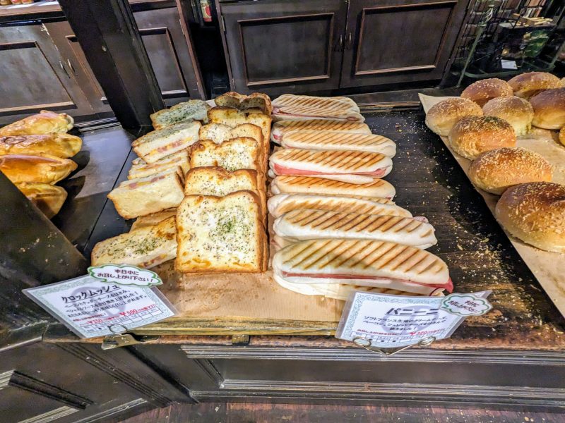 ソフトフランス生地にクリームチーズ、ベーコンを挟んだ焼いた「パニーニ(320円)」、ベーコン、チェダーチーズ、ベシャメルソースを挟んだ「クロックムッシュ(250円ハーフ)」、揚げないで焼き上げたカレーぎっしり「自家製カレーパン(350円)」。