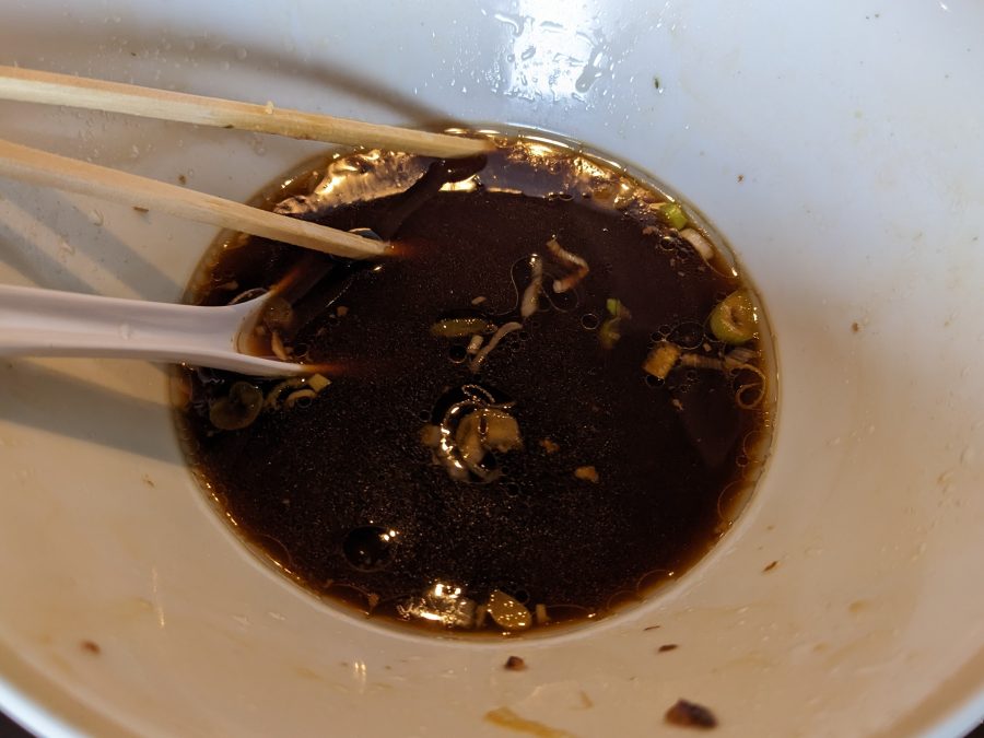 このスープは飲み干すタイプではなく、チャーシューと麺を食べるためのタレのような存在です。