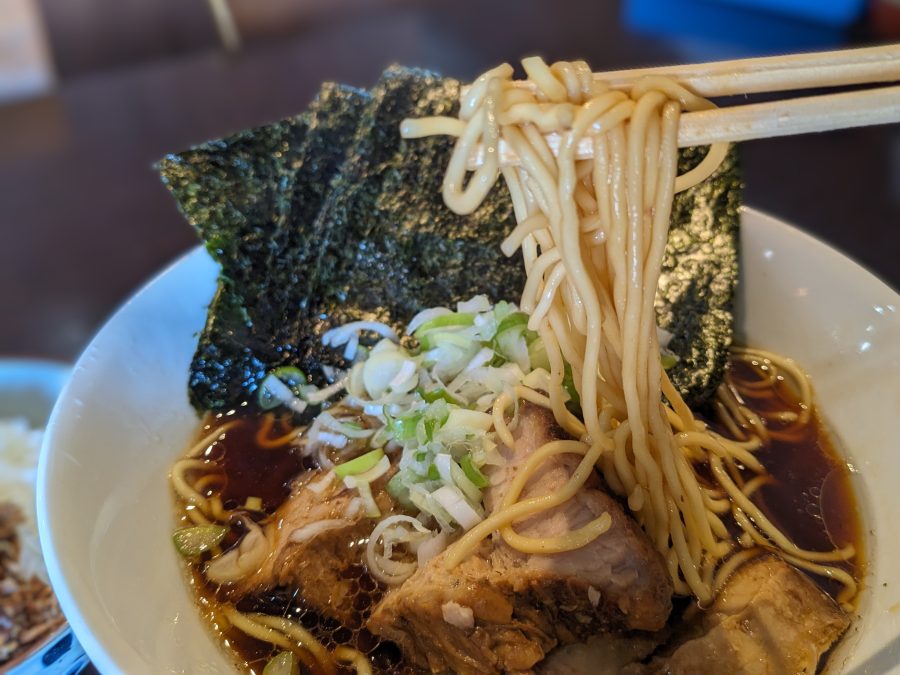 真っ黒なスープは、見た目どおりパンチの効いたしょっぱめの醤油味。ただ、竹岡式ラーメン特有のチャーシューの煮汁だけではなく、鶏ガラの出汁も効いています。