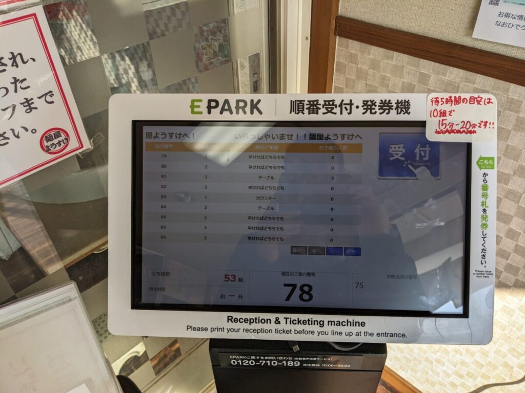 この時間にこんなに並んでいるとは想定していなかったため、びっくりしました。発券機に貼り付けられた案内によると、10組で15分から20分の待ち時間とのこと。