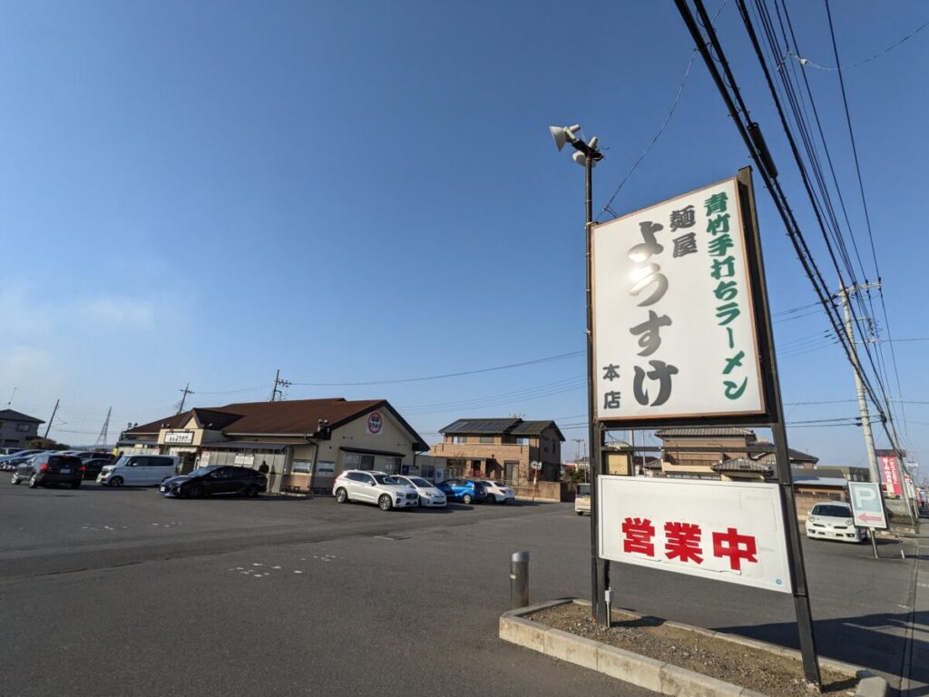 県道7号佐野行田線沿いにある麺屋ようすけ。大きな看板が目印です。