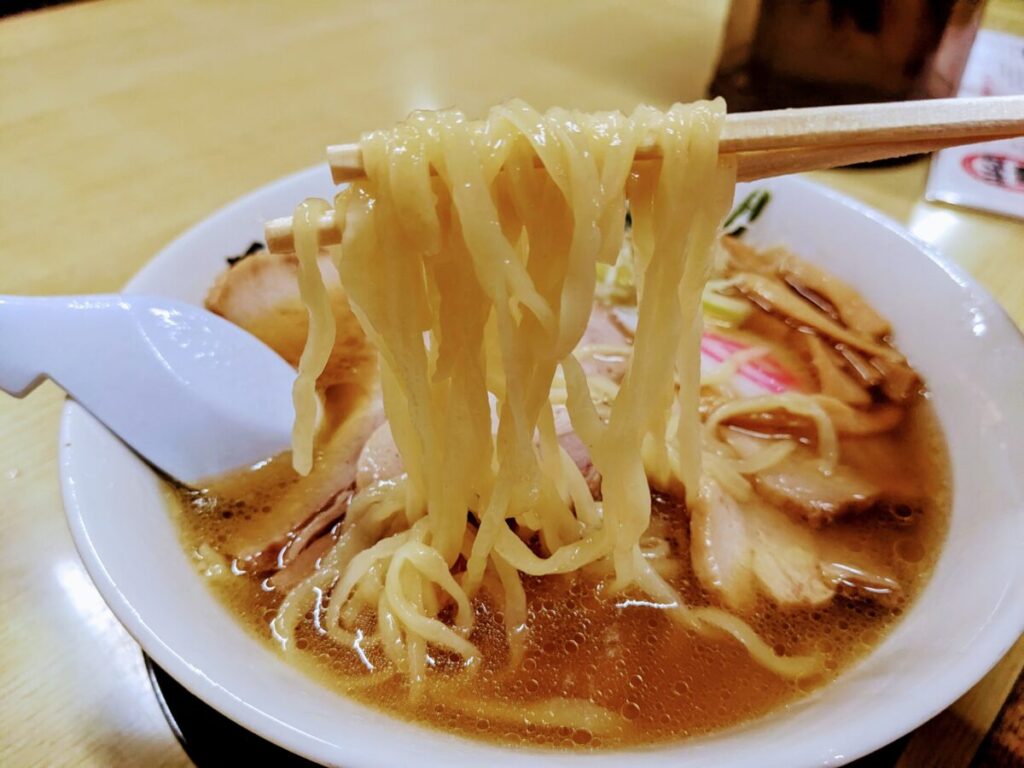 ようすけの麺は青竹で打った自家製麺。波打つように縮れた麺は、不揃いでモチモチとした食感を楽しめます。