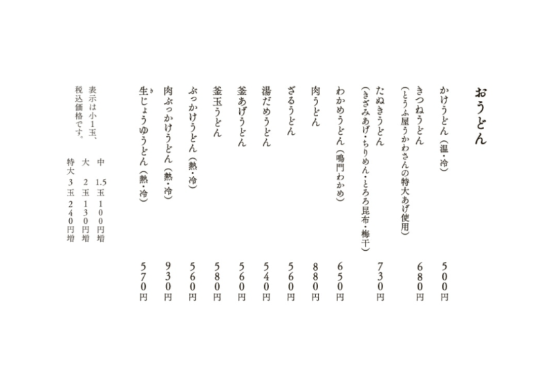 うどんの量は追加料金で選べます。中で1.5玉、大で2玉、特大で3玉です。追加なしでも天ぷらなども注文すれば、十分満足できる量です。