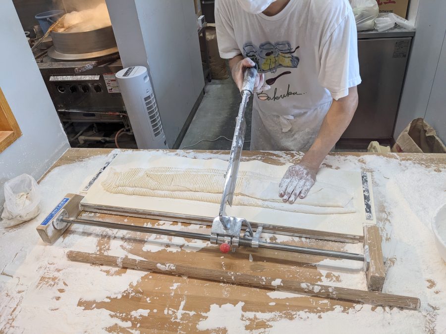 外からも見える場所に製麺室があり、その場で麺を打ち、麺を切り、切った麺を茹で麺機に入れていきます。