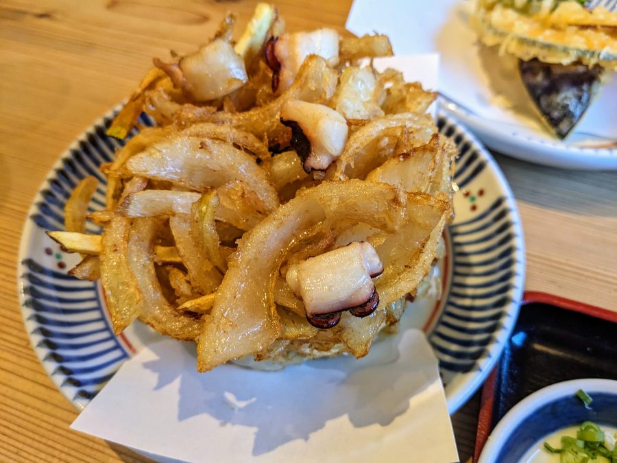 揚げたてで提供されるかき揚げは、衣が薄めで、サクサクとした食感。硬めのタコの弾力がいいアクセントになっています。