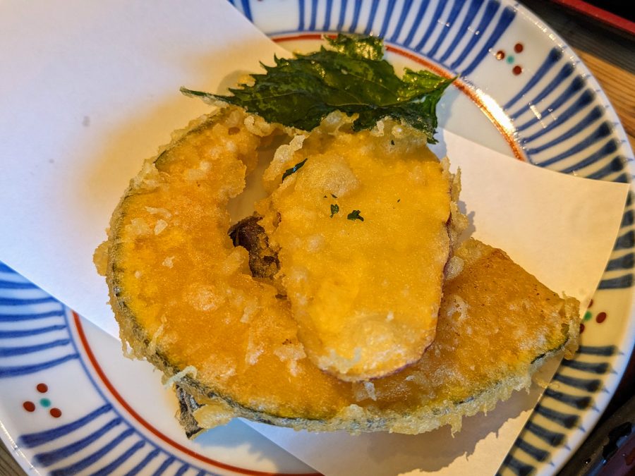 野菜の天ぷらは、さつまいも、かぼちゃ、なす、大葉の4種類。こちらも揚げたてでサクサク食感。