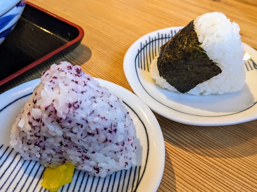 おにぎりは厨房前のショーケースに置かれているので、自分で好きなおにぎりを選んで取ります。粒が立った美味しいおにぎりです。