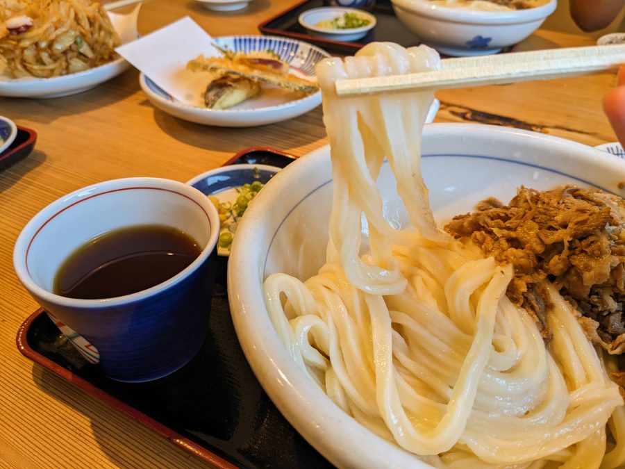 麺は通常のさぬきうどんのよりも、加水率高めで作られているため、モチモチとした弾力を楽しめます。また、リフトアップしきれないほど麺が長いのも特徴です。