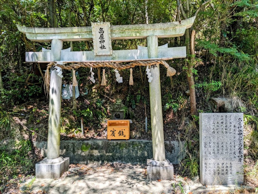 登り始めて10分程で高屋神社の中宮に到着。小さい鳥居と賽銭箱が置いてあります。