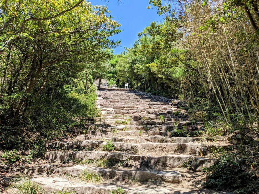 歩き始めて35分。この石段が見えたら、いよいよ天空の鳥居はすぐそこです。ただし、この石段は270段もある上に、一直線に伸びるかなりの急坂。