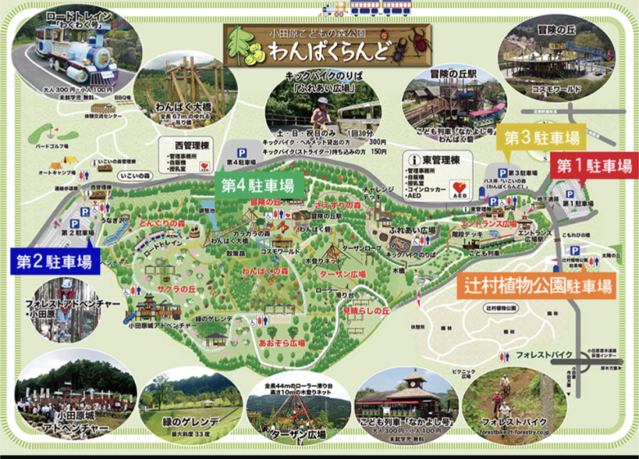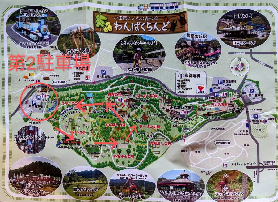 神奈川県小田原市にあるこどもの森わんぱくらんど。広い公園内に様々な遊具が点在していて、メインの遊び場は小田原場アドベンチャーとターザン広場、冒険の丘の3か所。公園の周り方や遊具、駐車場、注意点などをご紹介します。