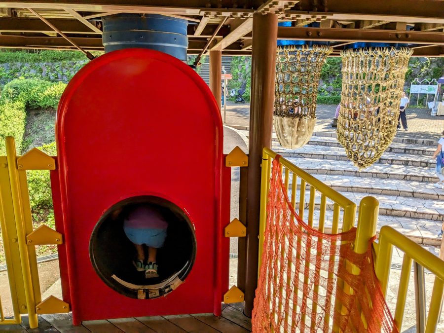 小田原城をモチーフとした複合遊具。ネットを渡ったり、うんていがあったり、トンネルがあったりといろいろな仕掛けを楽しめます。奥にある天守閣を目指しましょう!