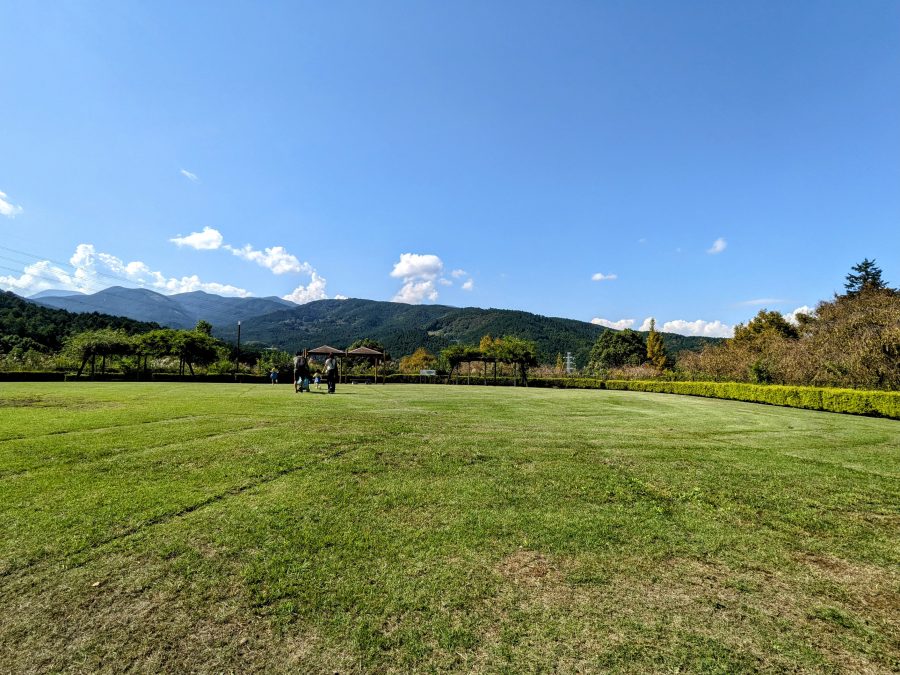 あおぞら広場は、芝生がきれいに整備されたとっても気持ちのいい広場です。バドミントンやボール遊びなどを楽しめます。