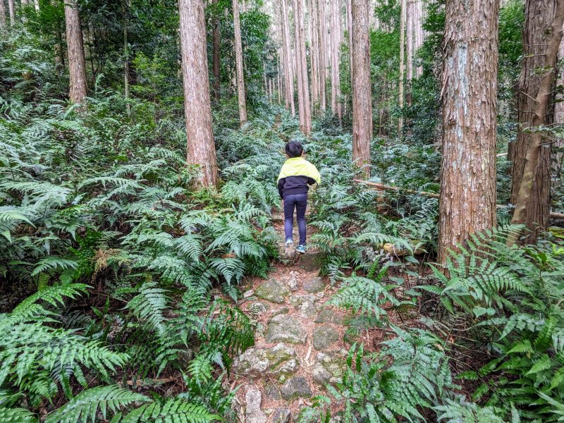 大きな杉の木に囲まれた道が続きます。基本的に景色は見えません。その分夏場は日陰になり歩きやすいと思います。