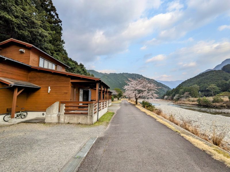 そのまま川沿いを歩きながらキャンプ場内を一番奥まで進んで行きます。春先に訪れたので川沿いに綺麗な桜が満開に咲いていました。