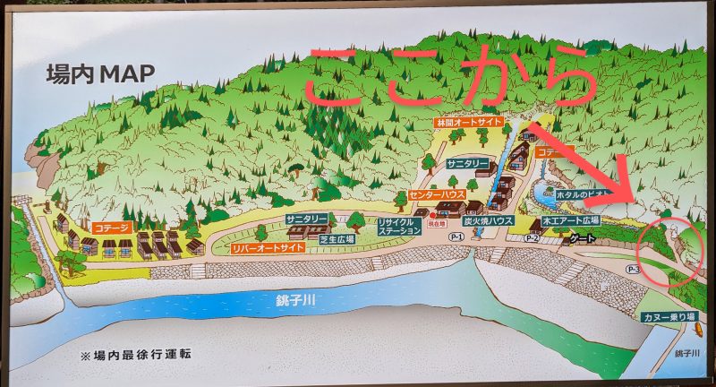 左側からゲートに入り、キャンプ場右端のゲートを抜けると◯で記された箇所に、登山口の案内が出てきます。