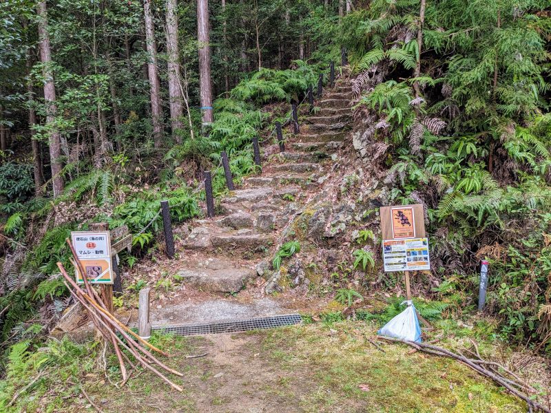 駐車場から歩き、ようやく登山道入り口に到着。整備された石畳の階段から像の背を目指してスタートです!