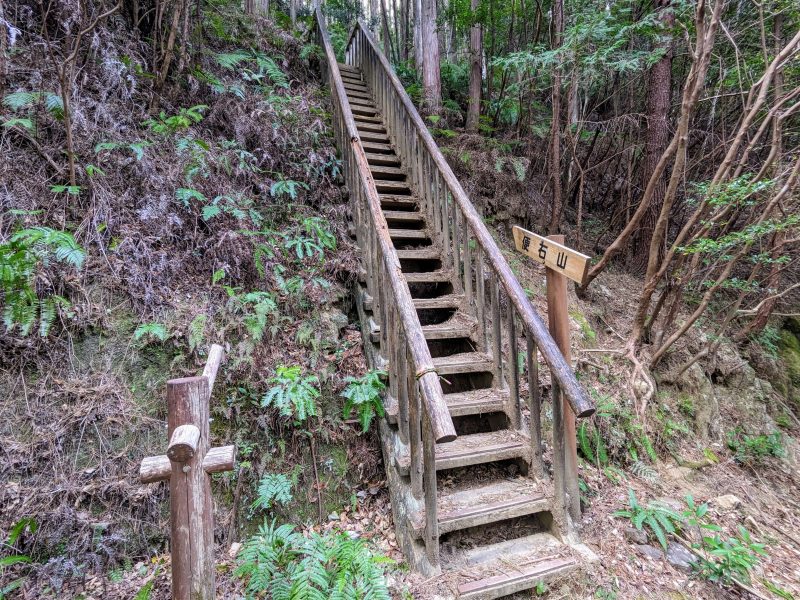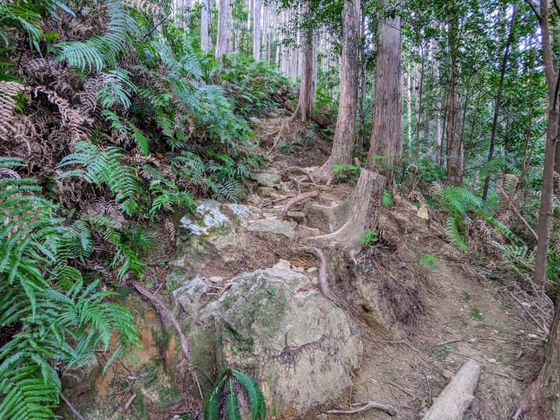 今までの整備された道から雰囲気が変わり、足場が悪く、急な登り坂が続くハードな登山道になります。普段運動をしていない人にとってはかなり大変な登山道です。